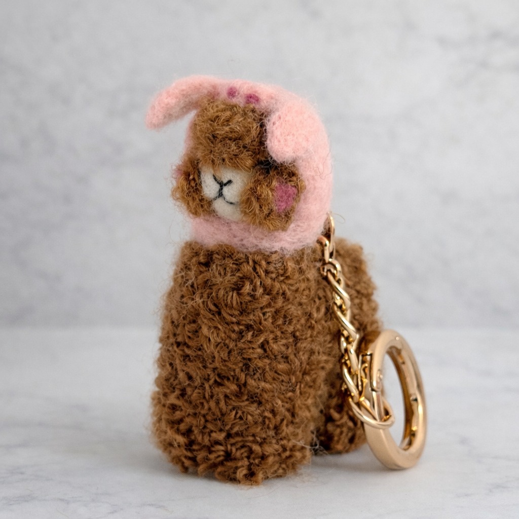 This fluffy little alpaca is all dressed up in its adorable pig hat, bringing maximum cuteness with a playful twist. Handcrafted from soft alpaca wool and finished with a luxe gold keychain, it’s the perfect mix of quirky and chic.
