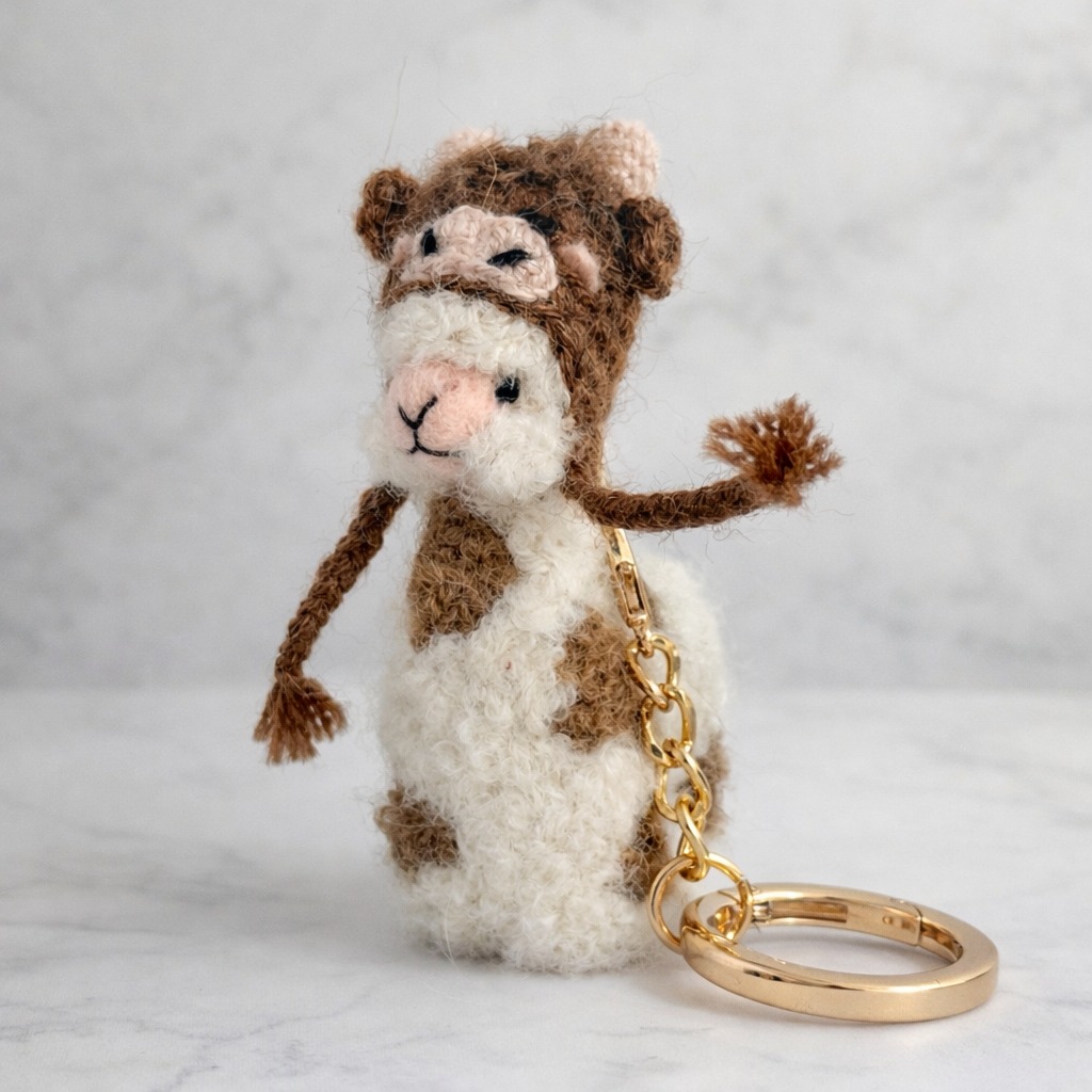 Handcrafted from luxurious alpaca wool and finished with a polished gold keychain, it’s the perfect blend of rustic cuteness and boutique style.