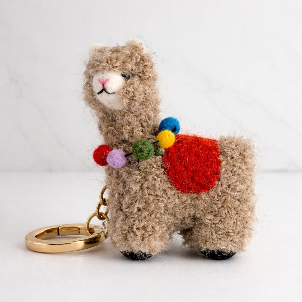 Handcrafted from luxurious alpaca and finished with a polished gold keychain, it blends joyful design with a boutique, elevated feel.